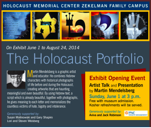 Mendelsberg combines Hebrew characters with historical photographs of life before and during the Holocaust.